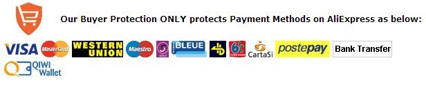 Todas las principales tarjetas de crédito son aceptadas a través de un proceso de pago seguro basado en el FIDEICOMISO; Transferencia bancaria; Western Union; Todo otro método que Aliexpress permite